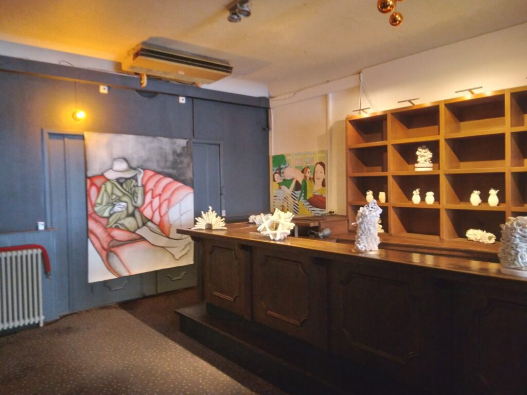 De bijzondere ruimte, met zijn intacte zaalnummers en fraaie foyer, biedt een unieke sfeer voor kunst.