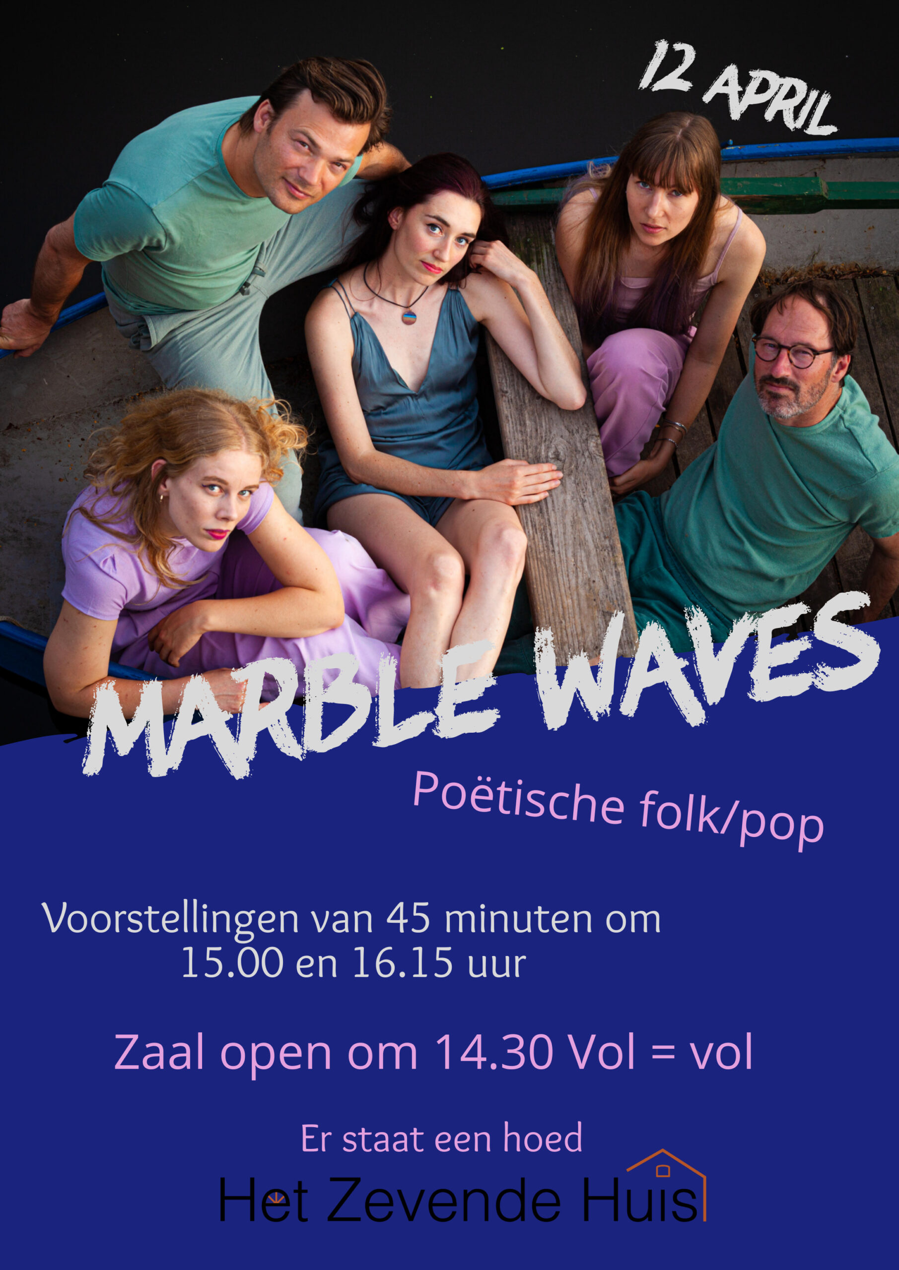 Op het huiskamer podium in de Knipsteeg staat op zondag 12 april de folkband Marble Waves uit Utrecht/Amsterdam.